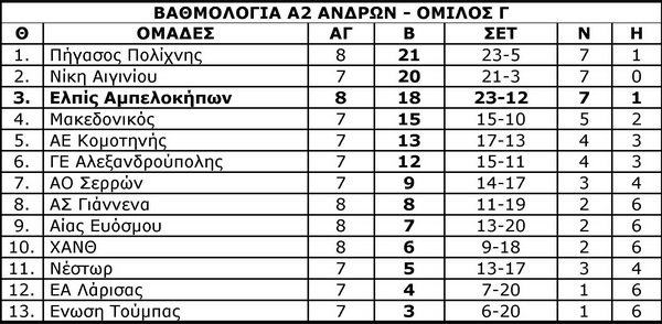 Την σπουδαιότερη φετινή της νίκη στο πρωτάθλημα της Α2 σημείωσε η ομάδα ανδρών της Ελπίδας, επικρατώντας μέσα στη Νεάπολη του Μακεδονικού με 3-0. Η ομάδα του Γιώργου Καραβιδόπουλου πραγματοποίησε την καλύτερη φετινή της εμφάνιση και ακολουθεί τον Πήγασο και τη Νίκη Αιγινίου, τις οποίες θα αντιμετωπίσει μέσα στον Δεκέμβριο.