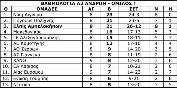 Συνέχισε τις καλές της εμφανίσεις η ανδρική ομάδα της Ελπίδας στην Α2, που νίκησε με 3-0 την ΑΕ Κομοτηνής και ετοιμάζεται για την αναμέτρηση κορυφής με τον Πήγασο Πολίχνης (Σάββατο 6/12), με τον οποίο ισοβαθμεί πλέον στην δεύτερη θέση του Γ ομίλου. Στον αγώνα με τους Θρακιώτες, οι παίκτες του Γιώργου Καραβιδόπουλου έδειξαν αποφασιστικότητα και, παρά κάποια «κενά» διαστήματα, είχαν συνεχώς το πάνω χέρι. Το παιχνίδι απέκτησε χαρακτήρα ντέρμπι στο τρίτο σετ, στο τέλος του οποίου οι φιλοξενούμενοι πλησίασαν στο σκορ, αλλά η Ελπίδα κατάφερε να αποφύγει τις περιπέτειες.