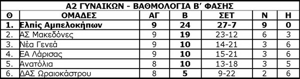 Κερδίζοντας τους Μακεδόνες Αξιού με 3-1 και σημειώνοντας την 21η νίκη σε ισάριθμους αγώνες, η γυναικεία ομάδα της Ελπίδας εξασφάλισε την πρώτη θέση στον Βόρειο Ομιλο και θα πάει αήττητη στο Τουρνουά Ανόδου για την Α1 (22-24 Απριλίου). Ο αγώνας είχε μόνο χαρακτήρα γοήτρου, αφού η πρόκριση των δύο ομάδων είχε ξεκαθαρίσει, και οι δύο προπονητές έκαναν αρκετά μεγάλο rotation, αφήνοντας κάποιες αθλήτριες έξω και δίνοντας χρόνο συμμετοχής σε νεαρές.