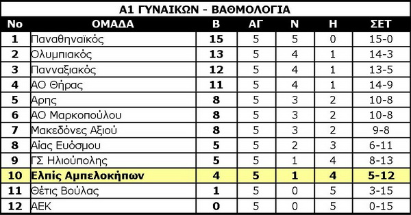 * Η 5η αγωνιστική (19/11): Θέτις – Ελπίδα, Αρης – Αίας, Πανναξιακός – Ολυμπιακός, Μακεδόνες – Μαρκόπουλο, Παναθηναϊκός – ΑΟ Θήρας, ΓΣ Ηλιούπολης – ΑΕΚ.