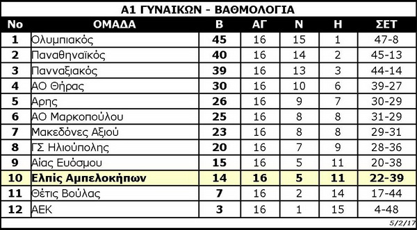 ΕΛΠΙΣ (Χρυσομαλλίδης): Παπάζογλου 14 (6/28 επ, 8 άσσοι, 43% υπ -29% άριστες), Γουίλσον, Μ. Μπολέτου 2 (2/5 επ), Κ. Μπολέτου 8 (6/23 επ, 1 άσσος, 1 μπλοκ), Καλανταρίδου 17 (15/26 επ, 2 μπλοκ, 25% υπ -21% άριστες), Καλαντάτζε 19 (10/19 επ, 6 άσσοι, 3 μπλοκ) – Σουπιώνη (λ, 64% υπ – 15% άριστες) – Δροσοπούλου 5 (3/10 επ, 1 άσσος, 1 μπλοκ), Γεροβασιλείου 11 (9/29 επ, 2 μπλοκ), Νώτη, Καραμούτσα, Kαλαϊτζάκη 4 (3 άσσοι, 1 μπλοκ).