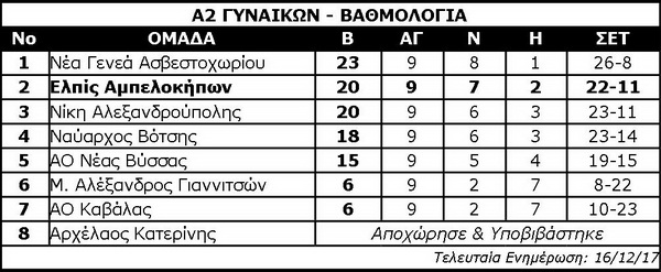 Μία από τις σημαντικότερες νίκες της περιόδου σημείωσε την Κυριακή η γυναικεία ομάδα της Ελπίδας, με 3-1 επί του ΑΟ Ν. Βύσσας. Με το σκορ αυτό ξέφυγε πέντε βαθμούς από την ομάδα του Εβρου και εξασφάλισε ουσιαστικά την είσοδό της στην τετράδα του Β1 ομίλου της Α2 Γυναικών, αφού υπερτερεί και σε περίπτωση ισοβαθμίας: στον α’ γύρο είχε χάσει με το ίδιο σκορ και διαφορά 3 πόντων (94-97), ενώ χτες νίκησε με διαφορά 11 πόντων (98-87).