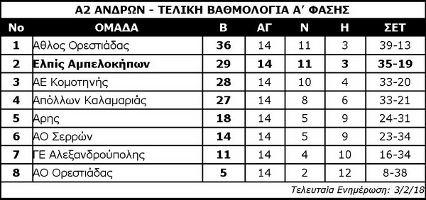 Συνεχίζοντας τις μέτριες εμφανίσεις των τελευταίων εβδομάδων, η ανδρική ομάδα της Ελπίδας ηττήθηκε με 3-1 στην Αλεξανδρούπολη από την ΓΕΑ, ωστόσο κρατήθηκε στην δεύτερη θέση της Α’ φάσης της Α2 χάρη στη νίκη – δώρο του ΑΟ Σερρών επί της ΑΕ Κομοτηνής. Για την ομάδα του Γιώργου Καραβιδόπουλου προέχει τώρα η ανασύνταξη εν όψει της δύσκολης συνέχειας.