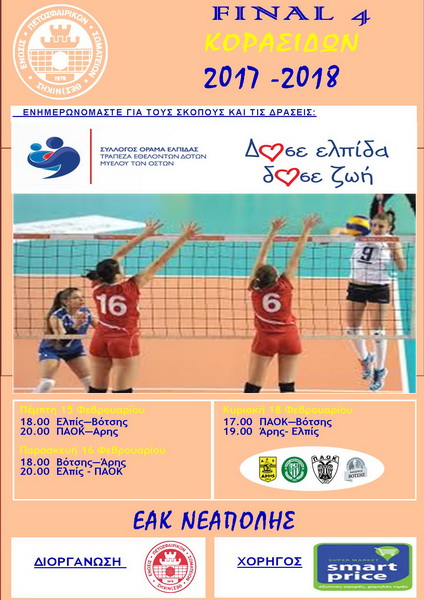 «Ευχή μας είναι σε αυτή την διοργάνωση (όπως πρέπει και σε κάθε διοργάνωση), βασικοί πρωταγωνιστές να είναι οι αθλήτριες και το τουρνουά να μείνει στο μυαλό τους χαραγμένη με τις καλύτερες εντυπώσεις. Θα πρέπει να βοηθήσουμε όλοι σ’ αυτό, διοργανωτές, σύλλογοι, γονείς και θεατές. Για οτιδήποτε άλλο, βασικοί υπαίτιοι θα είμαστε εμείς. Ας απολαύσουμε λοιπόν αυτό το Final Four και ας χειροκροτήσουμε τα παιδιά μας για την προσπάθειά τους. Καλή Επιτυχία σε όλους».