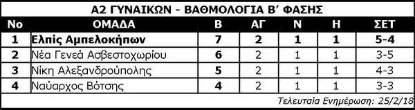 Στην πρώτη θέση της Β’ φάσης της Α2 Γυναικών σκαρφάλωσε η Ελπίδα, μετά την σπουδαία νίκη της επί της Νίκης Αλεξανδρούπολης με 3-1. Οι «πράσινες» έχασαν το πρώτο σετ στο οποίο προηγήθηκαν με 20-18, αλλά το έχασαν από δικά τους λάθη. Στη συνέχεια η Ελπίδα δυσκόλεψε πολύ το σέρβις της και αποδιοργάνωσε την ομάδα του Εβρου με αποτέλεσμα να φτάσει στην ανατροπή. Καθοριστικό ρόλο έπαιξαν οι νεαρές αθλήτριες που συμπλήρωσαν τις έμπειρες Αποστολίδου και Ελ. Σουπιώνη μετά το πρώτο σετ.