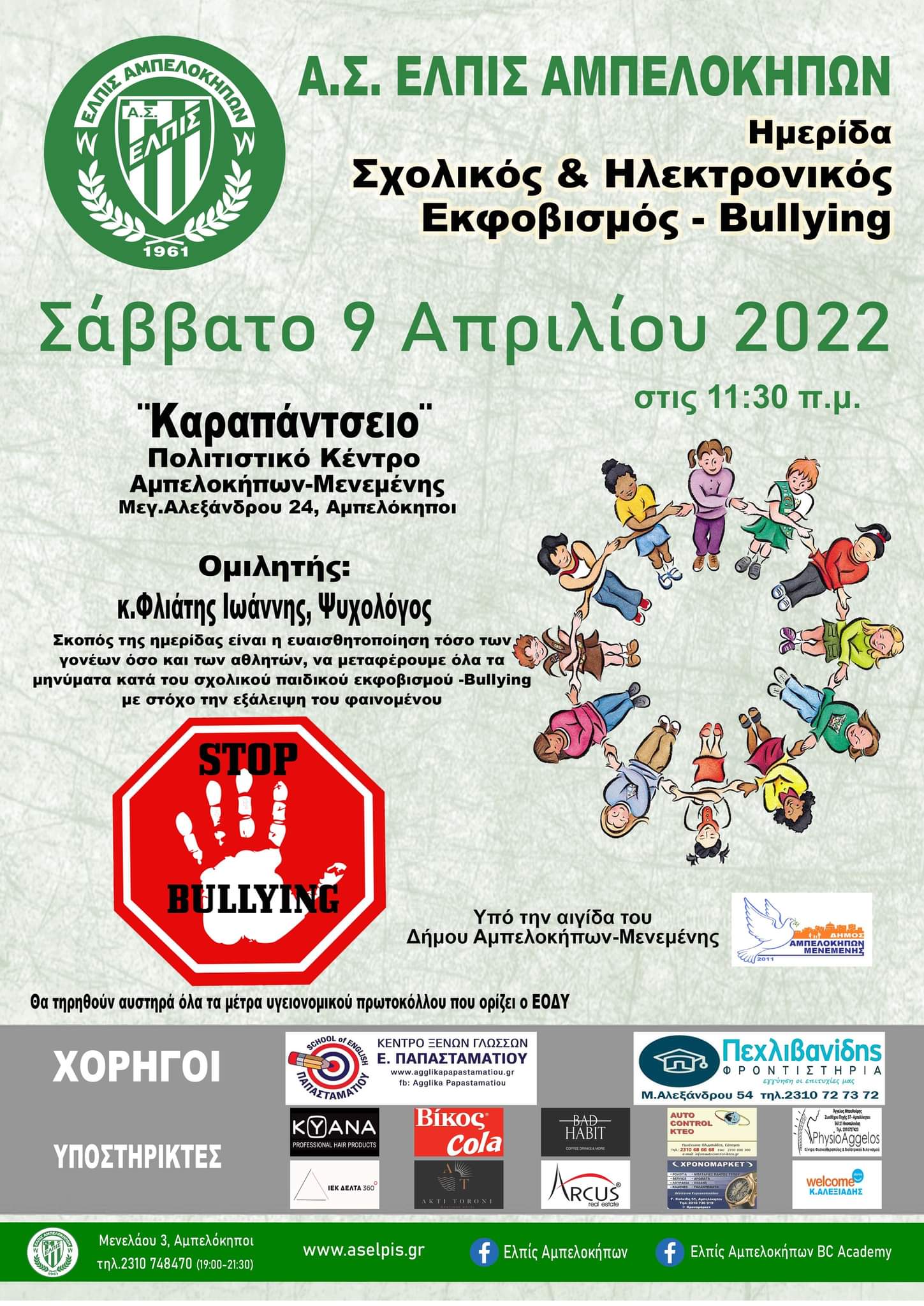 Μία ξεχωριστή και πολύ ενδιαφέρουσα ανοιχτή ενημερωτική εκδήλωση, με θέμα τον Σχολικό και ηλεκτρονικό εκφοβισμό (bullying), διοργανώνει ο ΑΣ Ελπίς το Σάββατο 9 Απριλίου, στις 11:30 π.μ., στο Καραπάντσειο Πολιτιστικό Κέντρο Αμπελοκήπων-Μενεμένης.
