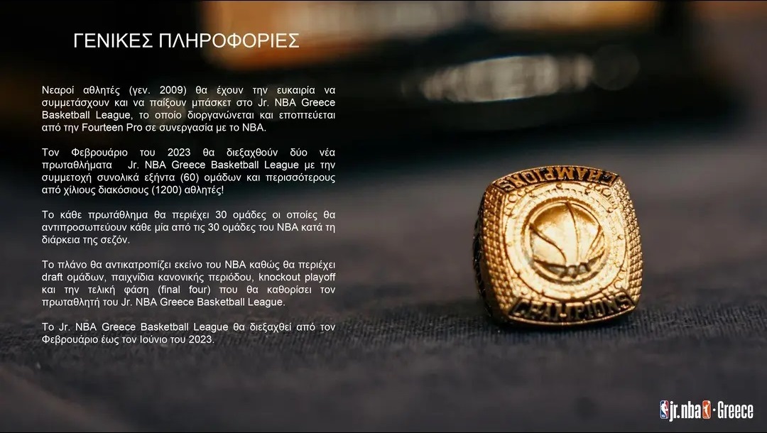 Επιλεγμένοι αθλητές μας (γεν. 2009 και μικρότεροι) θα έχουν την ευκαιρία να συμμετάσχουν και να παίξουν μπάσκετ στο Jr. NBA Greece Basketball League 2023, το οποίο διοργανώνεται και εκτελείται από την Fourteen Pro σε συνεργασία με το ΝΒΑ.