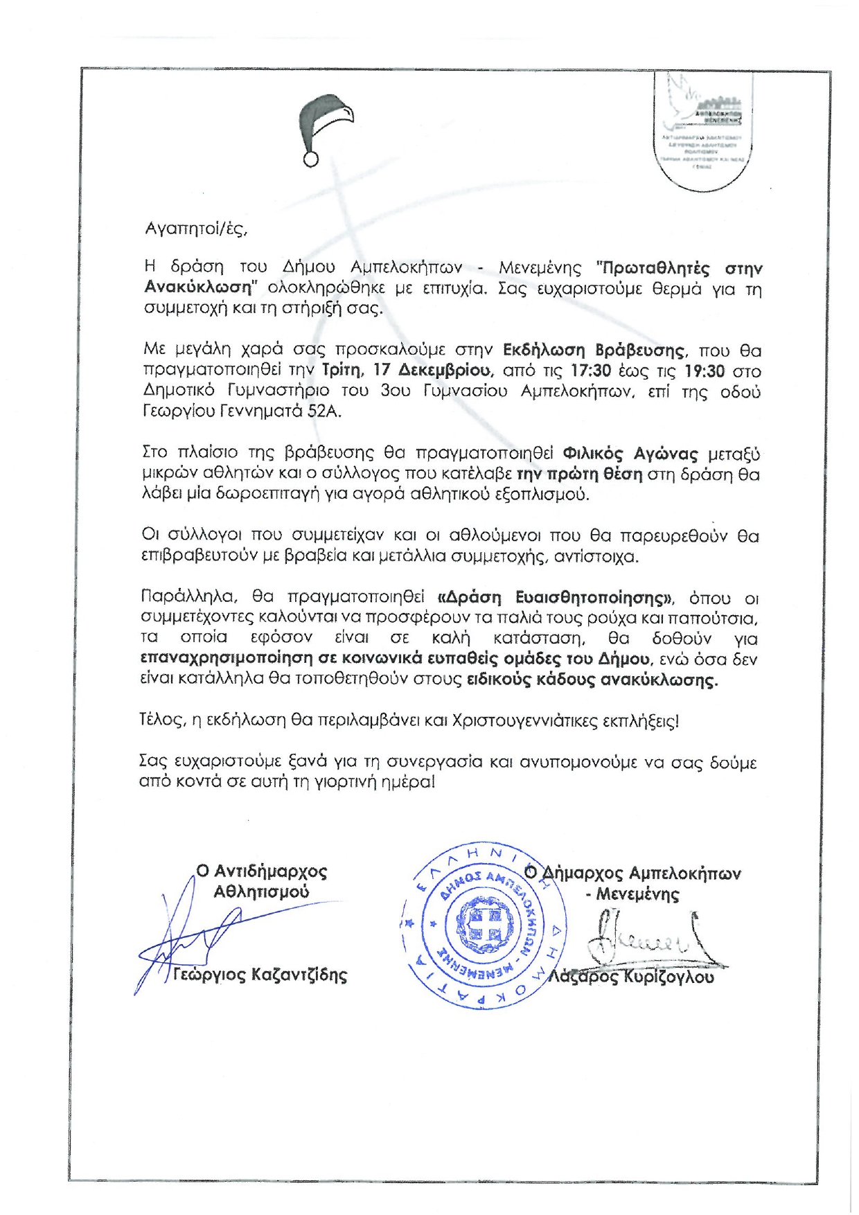 Ο ΑΣ Ελπίς υποστηρίζει τη δράση «Πρωταθλητές στην Ανακύκλωση» του Δήμου Αμπελοκήπων-Μενεμένης, η οποία θα ολοκληρωθεί με την Εκδήλωση Βράβευσης των συμμετεχόντων αθλητών και συλλόγων την Τρίτη 17 Δεκεμβρίου, ώρα 17:30 – 19:30, στο Δημοτικό Γυμναστήριο του 3ου Γυμνασίου Αμπελοκήπων, επί της οδού Γεωργίου Γεννηματά 52Α.