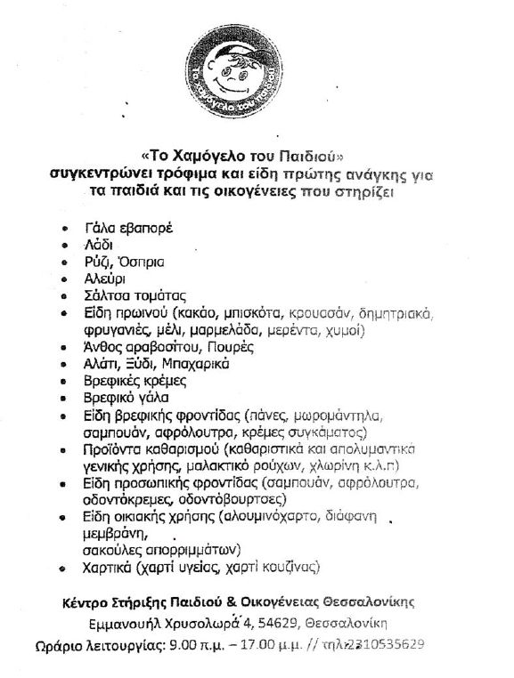 Μαζεύουμε στο γήπεδο για «Το Χαμόγελο του Παιδιού» τρόφιμα και είδη πρώτης ανάγκης από τη λίστα που ακολουθεί και με την πράξη αυτή στηρίζουμε έμπρακτα τα παιδιά, δυναμώνουμε το μήνυμα της προσφοράς και αποδεικνύουμε ότι ο αθλητισμός ενώνει!